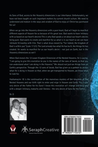 As Sons of God, access to the Heavenly dimensions is our inheritance. Unfortunately, we have not been taught on such important matters by current church culture. We need to understand and mature in the ways and wisdom of God to enjoy all Christ has purchased for us! When we go into the Heavenly dimensions with a pure heart, God will begin to manifest different aspects of Heaven for us because of His great love. When God reveals the 12 Lower Kingdom Dimension of the Nested Heavens, He is saying: "I am going to give this revelation to you in the names of the sons of Jacob, so that you can understand what I am doing in the Heavens." We should not just see things from an Earthly perspective. Through the 12 sons of Jacob, God has given us a pattern to access what He is doing in Heaven so that, when we get transported to Heaven, we know what to look for.Hashamayim 1B is the continuation of the marvelous mystery of the structure of The Nested Heavens and our birth right to enter and reign in Heaven and Earth. This is the very desire of the Father for his Sons! I know this revelation will change and bless you with a deeper intimacy, maturity and likeness - the very desire of Sons for the Father.Dr. OHashamayim 1B has several black and white diagrams of the Heavenly Dimensions. A limited edition full colour version is available from AACTEV8 or Dr O USA conferences.