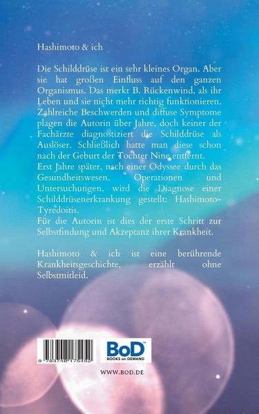 Die Schilddrüse ist ein sehr kleines Organ. Aber sie hat großen Einfluss auf den ganzen Organismus. Das merkt B. Rückenwind, als ihr Leben und sie nicht mehr richtig funktionieren. Zahlreiche Beschwerden und diffuse Symptome plagen die Autorin über Jahre, doch keiner der Fachärzte diagnostiziert die Schilddrüse als Auslöser. Schließlich hatte man diese schon nach der Geburt der Tochter Nine entfernt. Erst Jahre später, nach einer Odyssee durch das Gesundheitswesen, Operationen und Untersuchungen, wird die Diagnose einer Schilddrüsenerkrankung gestellt: Hashimoto-Tyredoitis. Für die Autorin ist dies der erste Schritt zur Selbstfindung und Akzeptanz ihrer Krankheit. Hashimoto & Ich ist eine berührende Krankheitsgeschichte, erzählt ohne Selbstmitleid.