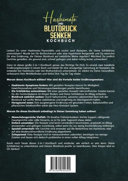 Leidest Du unter Hashimoto-Thyreoiditis und suchst nach Rezepten, die Deine Schilddrüse unterstützen? Wurde bei Dir Bluthochdruck oder eine Hypertonie festgestellt und Du wünschst Dir eine Ernährung, die Deinen Blutdruck auf natürliche Weise reguliert? Möchtest Du endlich Gerichte genießen, die gesund sind, schnell gelingen und dabei richtig lecker schmecken?Dann ist dieses große 2-in-1-Kochbuch genau das Richtige für Dich. Es vereint zwei bewährte Ernährungskonzepte in einem Buch und bietet Dir eine einzigartige Sammlung an Rezepten, die entweder bei Hashimoto oder bei Bluthochdruck unterstützen. So stärkst Du Deine Gesundheit, verbesserst Dein Wohlbefinden und fühlst Dich Tag für Tag vitaler.Warum dieses Kochbuch wählen? Hier sind die Vorteile beider Ernährungsweisen:- Hashimoto-Symptome lindern: Mit gezielten Rezepten kannst Du Müdigkeit, Gewichtszunahme und Stimmungsschwankungen positiv beeinflussen.- Die Schilddrüse unterstützen: Mit einer gezielten Auswahl nährstoffreicher Zutaten kannst Du die Hormonbalance im Körper fördern und Deine Schilddrüse im Alltag entlasten.- Blutdruck natürlich senken: Durch kaliumreiche, salzarme Lebensmittel lässt sich der Blutdruck auf sanfte Weise stabilisieren und langfristig im Gleichgewicht halten.- Herzgesund essen: Eine ausgewogene Ernährung mit gesunden Fetten, Ballaststoffen und pflanzlichen Inhaltsstoffen stärkt das Herz-Kreislauf-System.Warum Du dieses Kochbuch unbedingt in Deiner Sammlung haben solltest:- Abwechslungsreiche Vielfalt: Ob kreative Frühstücksideen, leichte Suppen, sättigende Hauptgerichte oder süße Desserts, es ist für jede Tageszeit etwas dabei.- Einfach umsetzbar: Die Rezepte sind leicht verständlich beschrieben, praxisnah im Alltag anzuwenden und gelingen zuverlässig, selbst wenn Du nur wenig Kocherfahrung mitbringst.- Speziell entwickelt: Alle Gerichte sind entweder auf die Bedürfnisse bei Hashimoto oder auf eine blutdruckfreundliche Ernährung abgestimmt.- Zeitsparend: Viele Rezepte sind imHandumdrehen zubereitet, benötigen nur wenige Zutaten und lassen sich dadurch problemlos in einen vollen Alltag integrieren.Kaufe noch heute dieses 2-in-1-Kochbuch und entdecke, wie einfach es sein kann, Deine Schilddrüse zu unterstützen und Deinen Blutdruck positiv zu beeinflussen. Dein Körper wird es Dir danken!
