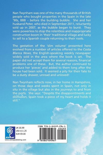 Nan Twynham was one of the many thousands of British people who bought properties in the Spain in the late '90s, BBB - before the building bubble. She and her husband Peter, who died in September 2011, reluctantly sold up in 2007, as the bubble began to burst. They were powerless to stop the relentless and inappropriate construction boom in 'their' traditional village and lucky to sell to a Spanish couple returning to their roots. The gestation of the 'slim volume' presented here evolved from a number of articles offered to the Costa Blanca News, the English-speaking weekly newspaper widely sold in the area where the book is set. The paper did not accept them for several reasons, financial problems one of these. But, the author continued to produce her 'pieces' and added to them long after the house had been sold. It seemed a pity for their fate to be a dusty drawer, unread and unloved! Nan Twynham reflects now, in her home in Hampshire, on those days and weeks spent in Spain, not only in situ in the village but also in the journeys to and from the ports. She says: "Despite the disappointments and disillusion, Spain took a piece of my heart and holds it still."