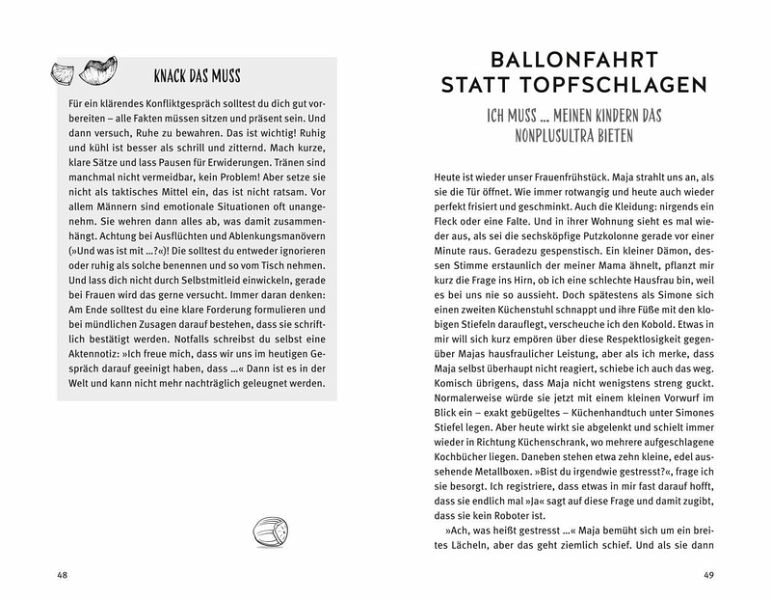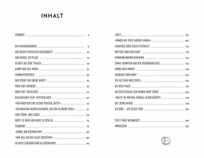 Hinweis zur OptimierungImpressumKnack das muss!VorwortDas UnterhosendingWie riecht eigentlich Hausarbeit?Wir reisen, ich planeSo weit die Füße tragen ...Kampf der SUV-MomsSandkastenspieleWer führt das große Wort?Mein Chef (gemein)Mein Chef (Heulsuse)Ballonfahrt statt Topfschlagen«Für mich nur eine kleine Portion, bitte!«»Ich brauche keinen Kalender, ich hab ja meine Frau.«Zwei Söhne, drei JungsNicht zu groß und nicht zu schlauVerbohrt»Komm, wir räumen um!«»Wie soll ich das alles schaffen?«Oh weh! Lebensgefahr! Klassenfahrt!Läuft ...»Immer mit Pfiff, unsere Damen«Linedance oder Gaelic Football?Mutter-Kind oder Kur?FeminismuskomplikationenEmma Thompson und der BegrüßungssatzEMMA oder Omma?Karriere oder Kind?Ich als Frau muss doch ...Die neue MajaEin Schutzraum zum Denken wär' schön»Hilfst du mir mal schnell in der Küche?«Die LächelmaskeIch darf ... ich selbst seinStatt eines NachwortsMarie Brunner