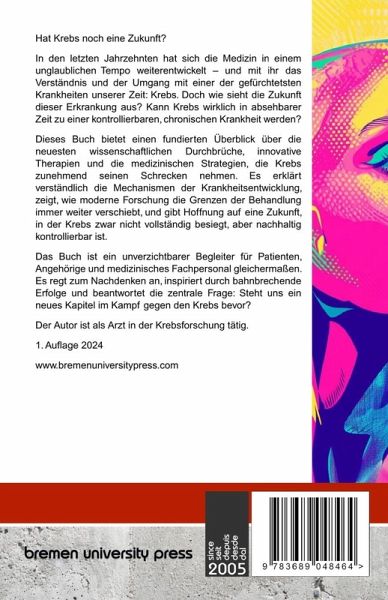 Hat Krebs noch eine Zukunft? In den letzten Jahrzehnten hat sich die Medizin in einem unglaublichen Tempo weiterentwickelt - und mit ihr das Verständnis und der Umgang mit einer der gefürchtetsten Krankheiten unserer Zeit: Krebs. Doch wie sieht die Zukunft dieser Erkrankung aus? Kann Krebs wirklich in absehbarer Zeit zu einer kontrollierbaren, chronischen Krankheit werden? Dieses Buch bietet einen fundierten Überblick über die neuesten wissenschaftlichen Durchbrüche, innovative Therapien und die medizinischen Strategien, die Krebs zunehmend seinen Schrecken nehmen. Es erklärt verständlich die Mechanismen der Krankheitsentwicklung, zeigt, wie moderne Forschung die Grenzen der Behandlung immer weiter verschiebt, und gibt Hoffnung auf eine Zukunft, in der Krebs zwar nicht vollständig besiegt, aber nachhaltig kontrollierbar ist. Das Buch ist ein unverzichtbarer Begleiter für Patienten, Angehörige und medizinisches Fachpersonal gleichermaßen. Es regt zum Nachdenken an, inspiriert durch bahnbrechende Erfolge und beantwortet die zentrale Frage: Steht uns ein neues Kapitel im Kampf gegen den Krebs bevor? Der Autor ist als Arzt in der Krebsforschung tätig.