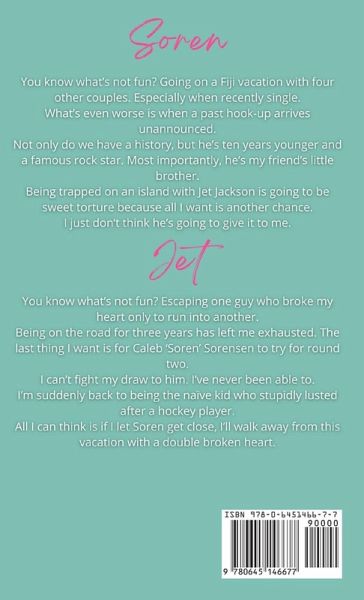 Soren: You know what's not fun? Going on a Fiji vacation with four other couples. Especially when recently single. What's even worse is when a past hook-up arrives unannounced. Not only do we have a history, but he's ten years younger and a famous rock star. Most importantly, he's my friend's little brother. Being trapped on an island with Jet Jackson is going to be sweet torture because all I want is another chance. I just don't think he's going to give it to me. Jet: You know what's not fun? Escaping one guy who broke my heart only to run into another. Being on the road for three years has left me exhausted. The last thing I want is for Caleb 'Soren' Sorensen to try for round two. I can't fight my draw to him. I've never been able to. I'm suddenly back to being the naïve kid who stupidly lusted after a hockey player. All I can think is if I let Soren get close, I'll walk away from this vacation with a double broken heart.