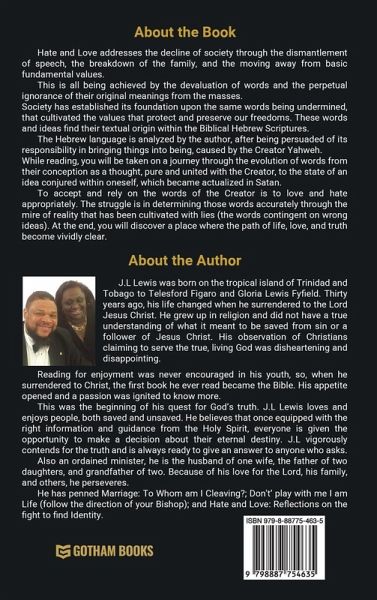 Hate and Love addresses the decline of society through the dismantlement of speech, the breakdown of the family, and moving away from basic fundamental values. This is all being achieved by the devaluation of words and the perpetual ignorance of their original meanings from the masses. Society has established its foundation upon the same words being undermined, that cultivated the values that protect and preserve our freedoms.These words and ideas find their textual origin within the Biblical Hebrew Scriptures. The Hebrew language is analyzed by the author, after being persuaded of its responsibility in bringing things into being, caused by the Creator Yahweh. While reading, you will be taken on a journey through the evolution of words from their conception as a thought, pure and united with the Creator, to the state of an idea conjured within oneself, which became actualized in Satan. To accept and rely on the words of the Creator is to love and hate appropriately. The struggle is in determining those words accurately through the mire of reality that has been cultivated with lies (the words contingent on wrong ideas). At the end, you will discover a place where the path of life, love, and truth becomes vividly clear.