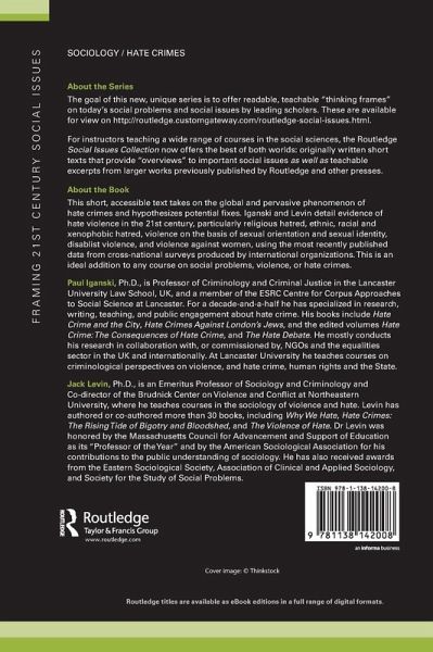 PAUL IGANSKI, Ph.D. is Professor of Criminology and Criminal Justice in the Lancaster University Law School, UK, and a member of the ESRC Centre for Corpus Approaches to Social Science at Lancaster. For a decade-and-a-half he has specialized in research, writing, teaching, and public engagement about hate crime. His books include Hate Crime and the City, Hate Crimes Against London's Jews, and the edited volumes Hate Crime: The Consequences of Hate Crime, and The Hate Debate. He mostly conducts his research in collaboration with, or commissioned by, NGOs and the equalities sector in the UK and internationally. At Lancaster University he teaches courses on criminological perspectives on violence, and hate crime, human rights and the State. JACK LEVIN, Ph.D. is an Emeritus Professor of Sociology and Criminology and Co-director of the Brudnick Center on Violence and Conflict at Northeastern University, where he teaches courses in the sociology of violence and hate. Levin has authored or co-authored more than 30 books, including Why We Hate , Hate Crimes: The Rising Tide of Bigotry and Bloodshed, and The Violence of Hate. Dr Levin was honored by the Massachusetts Council for Advancement and Support of Education as its "Professor of the Year" and by the American Sociological Association for his contributions to the public understanding of sociology. He has also received awards from the Eastern Sociological Society, Association of Clinical and Applied Sociology, and Society for the Study of Social Problems.