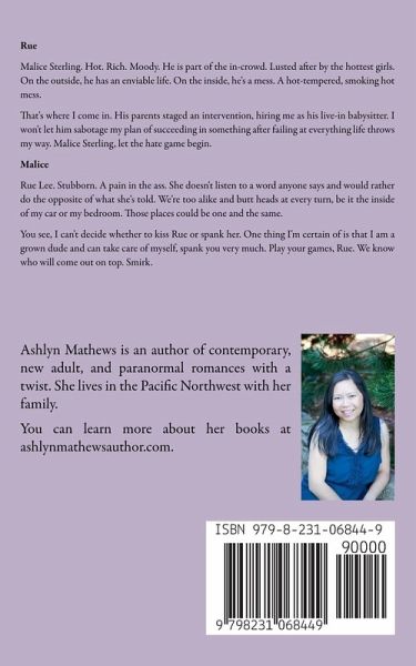 Rue Malice Sterling. Hot. Rich. Moody. He is part of the in-crowd. Lusted after by the hottest girls. On the outside, he has an enviable life. On the inside, he's a mess. A hot-tempered, smoking hot mess. That's where I come in. His parents staged an intervention, hiring me as his live-in babysitter. I won't let him sabotage my plan of succeeding in something after failing at everything life throws my way. Malice Sterling, let the hate game begin. Malice Rue Lee. Stubborn. A pain in the ass. She doesn't listen to a word anyone says and would rather do the opposite of what she's told. We're too alike and butt heads at every turn, be it the inside of my car or my bedroom. Those places could be one and the same. You see, I can't decide whether to kiss Rue or spank her. One thing I'm certain of is that I am a grown dude and can take care of myself, spank you very much. Play your games, Rue. We know who will come out on top. Smirk.