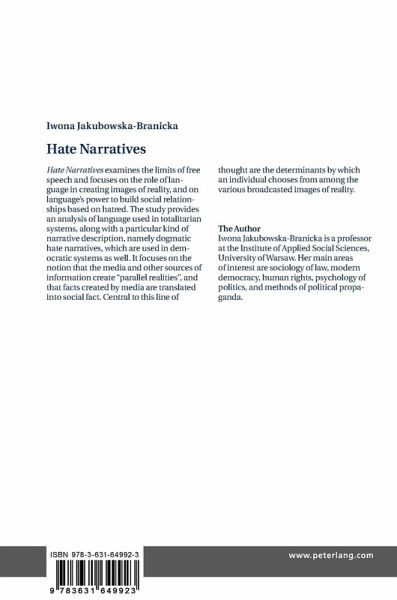 Hate Narratives examines the limits of free speech and focuses on the role of language in creating images of reality, and on language's power to build social relationships based on hatred. The study provides an analysis of language used in totalitarian systems, along with a particular kind of narrative description, namely dogmatic hate narratives, which are used in democratic systems as well. It focuses on the notion that the media and other sources of information create «parallel realities», and that facts created by media are translated into social fact. Central to this line of thought are the determinants by which an individual chooses from among the various broadcasted images of reality.