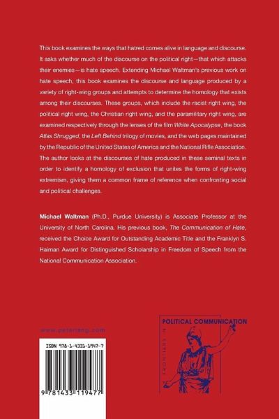 This book examines the ways that hatred comes alive in language and discourse. It asks whether much of the discourse on the political right - that which attacks their enemies - is hate speech. Extending Michael Waltman's previous work on hate speech, this book examines the discourse and language produced by a variety of right-wing groups and attempts to determine the homology that exists among their discourses. These groups, which include the racist right wing, the political right wing, the Christian right wing, and the paramilitary right wing, are examined respectively through the lenses of the film White Apocalypse, the book Atlas Shrugged, the Left Behind trilogy of movies, and the web pages maintained by the Republic of the United States of America and the National Rifle Association. The author looks at the discourses of hate produced in these seminal texts in order to identify a homology of exclusion that unites the forms of right-wing extremism, giving them a common frame of reference when confronting social and political challenges.
