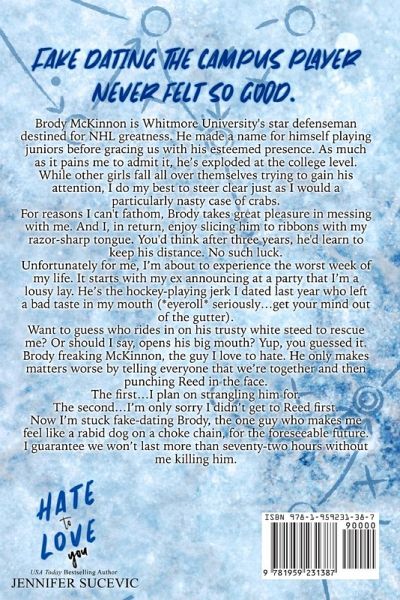 Fake dating the campus player never felt so good. Brody McKinnon is Whitmore University's star defenseman destined for NHL greatness. He made a name for himself playing juniors before gracing us with his esteemed presence. As much as it pains me to admit it, he's exploded at the college level. While other girls fall all over themselves trying to gain his attention, I do my best to steer clear just as I would a particularly nasty case of crabs. For reasons I can't fathom, Brody takes great pleasure in messing with me. And I, in return, enjoy slicing him to ribbons with my razor-sharp tongue. You'd think after three years, he'd learn to keep his distance. No such luck. Unfortunately for me, I'm about to experience the worst week of my life. It starts with my ex announcing at a party that I'm a lousy lay. He's the hockey-playing jerk I dated last year who left a bad taste in my mouth (*eyeroll* seriously...get your mind out of the gutter). Want to guess who rides in on his trusty white steed to rescue me? Or should I say, opens his big mouth? Yup, you guessed it. Brody freaking McKinnon, the guy I love to hate. He only makes matters worse by telling everyone that we're together and then punching Reed in the face. The first...I plan on strangling him for. The second...I'm only sorry I didn't get to Reed first. Now I'm stuck fake-dating Brody, the one guy who makes me feel like a rabid dog on a choke chain, for the foreseeable future. I guarantee we won't last more than seventy-two hours without me killing him.