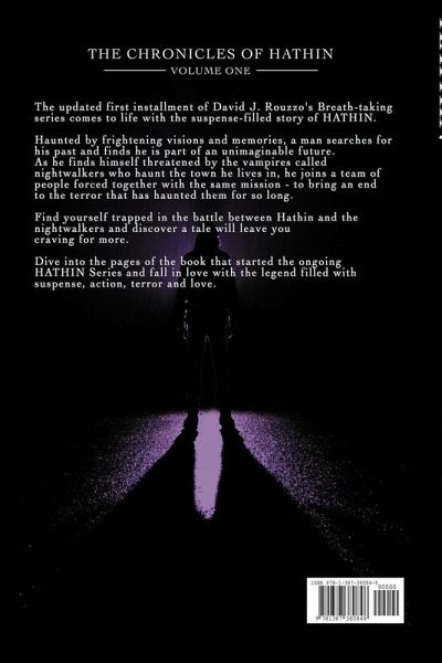 The first installment of David J. Rouzzo's breath-taking series comes to life with the suspense-filled story of HATHIN. Haunted by frightening visions and memories, a man searches for his past and finds he is part of an unimaginable future. As he finds himself threatened by the vampires called nightwalkers who haunt the town he lives in, he joins a team of people forced together with the same mission - to bring an end to the terror that has haunted them for so long. Find yourself trapped in the battle between Hathin and the nightwalkers and discover a tale will leave you craving for more. Dive into the pages of the book that started the ongoing HATHIN Series and fall in love with the legend filled with suspense, action, terror and love.
