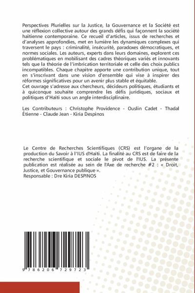 Perspectives Plurielles sur la Justice, la Gouvernance et la Société est une réflexion collective autour des grands défis qui façonnent la société haïtienne contemporaine. Ce recueil d'articles, issus de recherches et d'analyses approfondies, met en lumière les dynamiques complexes qui traversent le pays : criminalité, insécurité, paradoxes démocratiques, et normes sociales. Les auteurs, experts dans leurs domaines, explorent ces problématiques en mobilisant des cadres théoriques variés et innovants tels que la théorie de l'imbrication territoriale et celle des choix publics incompatibles. Chaque chapitre apporte une contribution unique, tout en s'inscrivant dans une vision d'ensemble qui vise à inspirer des réformes significatives pour un avenir plus stable et équitable.Cet ouvrage s'adresse aux chercheurs, décideurs politiques, étudiants et à quiconque souhaite comprendre les défis juridiques, sociaux et politiques d'Haïti sous un angle interdisciplinaire.Les Contributeurs : Christophe Providence - Ouslin Cadet - Thadal Étienne - Claude Jean - Kiria Despinos