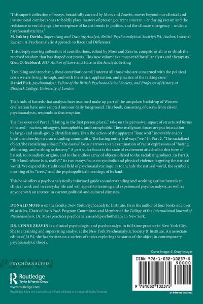 The kinds of hatreds that analysts have assumed make up part of the unspoken backdrop of Western civilization have now erupted into our daily foreground. This book, consisting of essays from eleven psychoanalysts, responds to that eruption. The five essays of Part 1, "Hating in the first person plural," take on the pervasive impact of structured forms of hatred - racism, misogyny, homophobia, and transphobia. These malignant forces are put into action by large- and small-group identifications. Even the action of the apparent "lone wolf" inevitably enacts loyal membership in a surrounding community. The hating entity is always "we." In Part 2, "The racialized object/the racializing subject," the essays' focus narrows to an examination of racist expressions of "hating, abhorring, and wishing to destroy." A particular focus is the state of excitement attached to this form of hatred, to its sadistic origins, and to the endless array of objects offered to the racializing subject. In Part 3, "This land: whose is it, really?," its two essays focus on symbolic and physical violence targeting the natural world. We expand the traditional field of psychoanalytic inquiry to include the natural world, the symbolic meaning of its "trees," and the psychopolitical meanings of its land. This book offers a psychoanalytically informed guide to understanding and working against hatreds in clinical work and in everyday life and will appeal to training and experienced psychoanalysts, as well as anyone with an interest in current political and cultural climates.