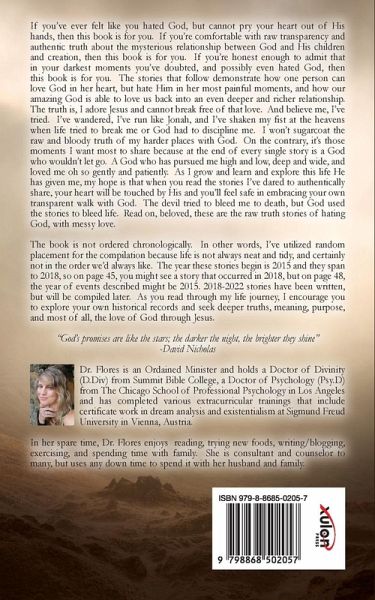 If you've ever felt like you hated God, but cannot pry your heart out of His hands, then this book is for you. If you're comfortable with raw transparency and authentic truth about the mysterious relationship between God and His children and creation, then this book is for you. If you're honest enough to admit that in your darkest moments you've doubted, and possibly even hated God, then this book is for you. The stories that follow demonstrate how one person can love God in her heart, but hate Him in her most painful moments, and how our amazing God is able to love us back into an even deeper and richer relationship. The truth is, I adore Jesus and cannot break free of that love. And believe me, I've tried. I've wandered, I've run like Jonah, and I've shaken my fist at the heavens when life tried to break me or God had to discipline me. I won't sugarcoat the raw and bloody truth of my harder places with God. On the contrary, it's those moments I want most to share because at the end of every single story is a God who wouldn't let go. A God who has pursued me high and low, deep and wide, and loved me oh so gently and patiently. As I grow and learn and explore this life He has given me, my hope is that when you read the stories I've dared to authentically share, your heart will be touched by His and you'll feel safe in embracing your own transparent walk with God. The devil tried to bleed me to death, but God used the stories to bleed life. Read on, beloved, these are the raw truth stories of hating God, with messy love. The book is not ordered chronologically. In other words, I've utilized random placement for the compilation because life is not always neat and tidy, and certainly not in the order we'd always like. The year these stories begin is 2015 and they span to 2018, so on page 45, you might see a story that occurred in 2018, but on page 48, the year of events described might be 2015. 2018-2022 stories have been written, but will be compiled later. As you read through my life journey, I encourage you to explore your own historical records and seek deeper truths, meaning, purpose, and most of all, the love of God through Jesus. "God's promises are like the stars; the darker the night, the brighter they shine" -David Nicholas Dr. Flores is an Ordained Minister and holds a Doctor of Divinity (D.Div) from Summit Bible College, a Doctor of Psychology (Psy.D) from The Chicago School of Professional Psychology in Los Angeles and has completed various extracurricular trainings that include certificate work in dream analysis and existentialism at Sigmund Freud University in Vienna, Austria. In her spare time, Dr. Flores enjoys reading, trying new foods, writing/blogging, exercising, and spending time with family. She is consultant and counselor to many, but uses any down time to spend it with her husband and family.