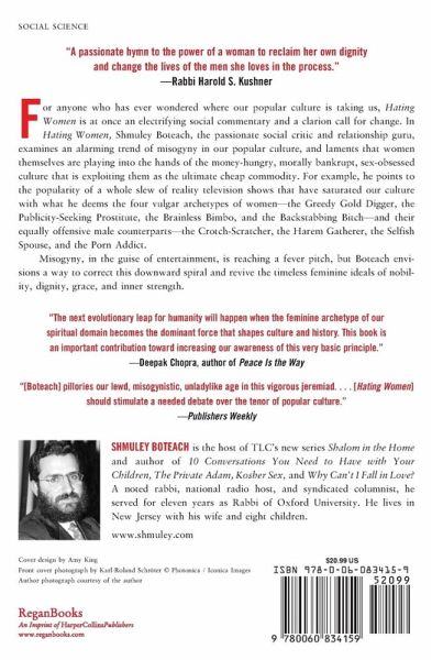 From the author of the internationally bestselling Kosher Sex. A wake-up call about the growing trend of misogyny in our culture-as evidenced by the flood of reality TV shows, ads, and lyrics that portray women as brainless bimbos, or worse Shmuley Boteach, the social commentator and outspoken relationship guru, shares his grave concerns about our society's growing contempt for women. Turn on the television: Reality TV shows such as The Bachelor, For Love or Money, and Average Joe boost their ratings by showing attractive women in competition for one man, one man's money, or both. On a "quest for true love," these women quickly devolve into a pit of vipers-and millions of Americans tune in each week for more. During commercial breaks, women are objectified to sell beer, cars, and every other product under the sun. Flip on the radio: Women are bitches, hos, and gold diggers, at least if you listen to the rap lyrics pumping out into our mass consciousness. And female pop stars like Britney and Madonna, says Boteach, have pushed the envelope past provocative and into the downright pornographic. 'Tween girls across the country follow their lead, and standards for how women should be treated plummet. Perhaps one of the most troubling aspects of this trend, he says, is women's complicity in their own degradation. Either they've become resigned to base stereotypes, or worse, they've bought into these mass market values (hence the deluge of shows like The Swan and Extreme Makeover, on which female contestants insist they need a new nose, teeth, or boobs to feel a positive sense of self-esteem). "There are strong consequences," writes Boteach, "in a world where men have no respect for women and women have no respect for themselves." Greedy gold diggers, brainless bimbos, publicity prostitutes, and backstabbing bitches-are these the stereotypes we want our sons and daughters bombarded by as they grow up? Hating Women offers a vision of how we can correct this downward spiral-along with a strong argument for why we absolutely must.