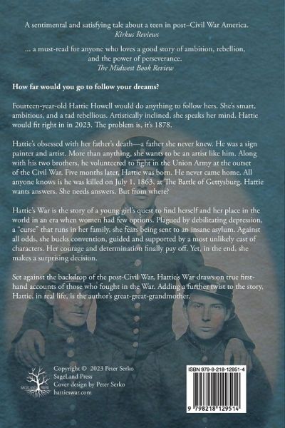 How far would you go to follow your dreams? Fourteen-year-old Hattie Howell would do anything to follow hers. She's smart, ambitious, and a tad rebellious. Artistically inclined, she speaks her mind. Hattie would fit right in 2023. The problem is, it's 1878. Hattie's obsessed with her father's death-a father she never knew. He was a sign painter and artist. More than anything, she wants to be an artist like him. Along with his two brothers, he volunteered to fight in the Union Army at the outset of the Civil War. Five months later, Hattie was born. He never came home. All anyone knows is he was killed on July 1, 1863, at The Battle of Gettysburg. Hattie wants answers. She needs answers. But from where? Hattie's War is the story of a young girl's quest to find herself and her place in the world in an era when women had few options. Plagued by debilitating depression, a "curse" that runs in her family, she fears being sent to an insane asylum. Against all odds, she bucks convention, guided and supported by a most unlikely cast of characters. Her courage and determination finally pay off. Yet, in the end, she makes a surprising decision. Set against the backdrop of the post-Civil War, Hattie's War draws on true first-hand accounts of those who fought in the War. Adding a further twist to the story, Hattie, in real life, is the author's great-great-grandmother.