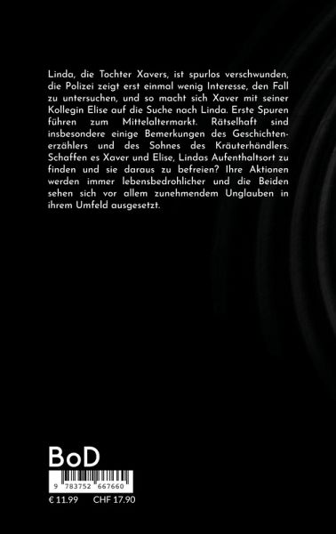 Linda, die Tochter Xavers, ist spurlos verschwunden, die Polizei zeigt erst einmal wenig Interesse, den Fall zu untersuchen, und so macht sich Xaver mit seiner Kollegin Elise auf die Suche nach Linda. Erste Spuren führen zum Mittelaltermarkt. Rätselhaft sind insbesondere einige Bemerkungen des Geschichtenerzählers und des Sohnes des Kräuterhändlers. Schaffen es Xaver und Elise, Lindas Aufenthaltsort zu finden und sie daraus zu befreien? Ihre Aktionen werden immer lebensbedrohlicher und die Beiden sehen sich vor allem zunehmendem Unglauben in ihrem Umfeld ausgesetzt.