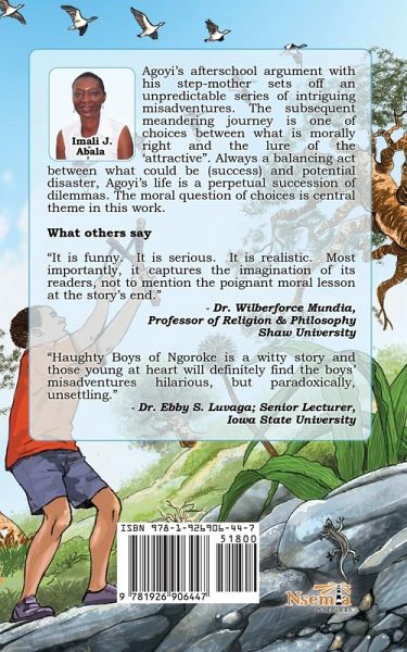 Haughty Boys of Ngoroke Agoyi's afterschool argument with his step-mother sets off an unpredictable series of intriguing misadventures. The subsequent meandering journey is one of the choices between what is morally right and the lure of the 'attractive". Always a balancing act between what could be (success) and potential disaster, Ayoyi's life is a perpetual succession of dilemmas. The moral question of choices is the central theme of this work. What others say 'It is funny. It is serious. It is realistic. Most importantly, it captures the imagination of its readers, not to mention the poignant moral lesson at the story's end.' - Dr. Wilberforce Mundia, Professor of Religion & Philosophy, Shaw University ' Haughty Boys of Ngoroke is a witty story and those young at heart will definitely find the boys' misadventures hilarious, but paradoxically, unsettling.' - Dr. Ebby S. Luvaga; Senior Lecturer, Iowa State University