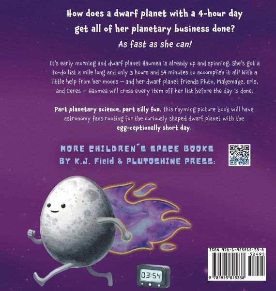How does a dwarf planet with a 4-hour day get all of her planetary business done? As fast as she can!! It's early morning and dwarf planet Haumea is already up and spinning. She's got a to-do list a mile long and only 3 hours and 54 minutes to accomplish it all! With a little help from her moons - and her dwarf planet friends Pluto, Makemake, Eris, and Ceres - Haumea will cross every item off her list before the day is done. Haumea's Big Day teaches little outer space fans all about the fascinating dwarf planet Haumea using an engaging storyline, playful rhyming verse, and vibrant watercolor illustrations. Bonus science facts on each page provide context for the story, as well as additional information about our solar system. Part planetary science, part silly fun, this rhyming picture book will have astronomy fans rooting for the curiously shaped dwarf planet with the EGG-ceptionally short day! Haumea's Big Day offers a fun and engaging approach to STEM and children's astronomy. It is ideal for toddlers, preschoolers, kindergarteners, and early elementary-school-age children up to age 9 who love outer space!