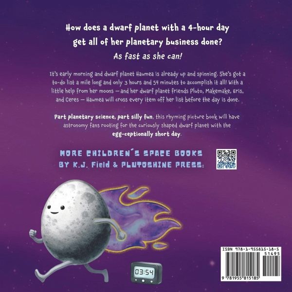 How does a dwarf planet with a 4-hour day get all of her planetary business done? As fast as she can!! It's early morning and dwarf planet Haumea is already up and spinning. She's got a to-do list a mile long and only 3 hours and 54 minutes to accomplish it all! With a little help from her moons - and her dwarf planet friends Pluto, Makemake, Eris, and Ceres - Haumea will cross every item off her list before the day is done. Haumea's Big Day teaches little outer space fans all about the fascinating dwarf planet Haumea using an engaging storyline, playful rhyming verse, and vibrant watercolor illustrations. Bonus science facts on each page provide context for the story, as well as additional information about our solar system. Part planetary science, part silly fun, this rhyming picture book will have astronomy fans rooting for the curiously shaped dwarf planet with the EGG-ceptionally short day! Haumea's Big Day offers a fun and engaging approach to STEM and children's astronomy. It is ideal for toddlers, preschoolers, kindergarteners, and early elementary-school-age children up to age 9 who love outer space!