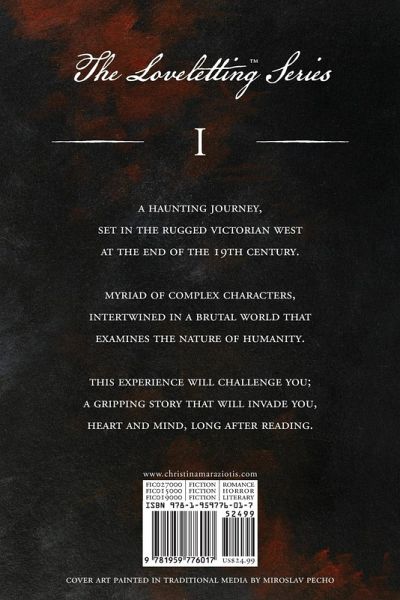 ¿ GOLD WINNER FOR ROMANCE IN THE 2023 FEATHERED QUILL BOOK AWARDS ¿ A young woman who learns to become strong in the face of impossible circumstances, and a man who finds light in the midst of overwhelming darkness. Prepare yourself for the first book in a haunting new series...Loveletting. Fleeing from her home after escaping the murder of her mother, inexperienced and petrified by reality with her horse as her only companion - Charlotte is met by the most notorious serial killer of the nation. His dark past and her dark future collide, in a world filled with dangers far greater than him. Set in the rugged Victorian west at the end of the 19th century with a myriad of complex characters, all intertwined in a brutal environment that examines the conflicting nature and morality of humanity. Charlotte may be innocent at heart, but the world she lives in is not. Filled with dangers from gangs to cults and a mysterious horror element that persists throughout - the overarching gothic love story fills this thrilling, dark adventure up until the haunting end...leaving the reader with an existential dread so deep that it must be read to be understood, yet craving for more. This novel is definitely for an adult audience, as the content is very heavy and challenging. It will appeal to those interested in a gothic romance with undertones of psychological horror. Most importantly, this book is a form of literary fiction; as character development is the most crucial factor in telling this story and it does not follow the typical tropes of a genre book. Subtle hints to the dark machinations behind the scenes, and interweaving characters who gradually change and grow over time, all work together to create a living world - filled with the unexpected - in which to lose yourself within. If you want something to read on autopilot, and wish for the plot to follow a certain expected pattern, this is not the book for you. This experience will challenge you; a gripping story that will invade you, heart and mind, long after reading.