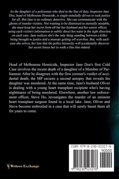 Head of Melbourne Homicide, Inspector Jane Doe's first Cold Case involves the recent death of a daughter of a Member of Parliament. After he disagrees with the first coroner's verdict of accidental death, the MP secures a second autopsy that reveals his daughter was murdered. At the same time, Jane's husband Oliver is dealing with a young heart transplant recipient who's having nightmares of being murdered. Elsewhere, another law enforcement officer, Steve Ho, investigates the murder of an eminent heart transplant surgeon found in a local lake. Jane, Oliver and Steve become embroiled in a case that will surely haunt them all for years to come.