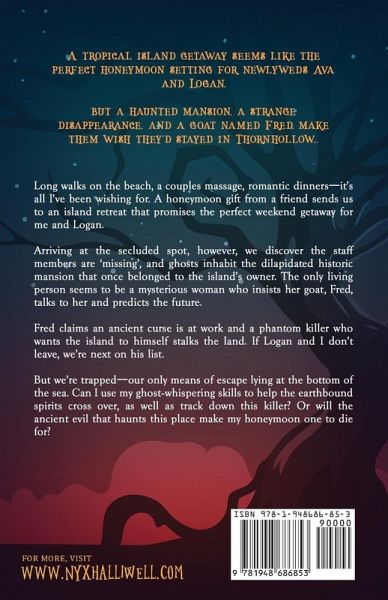 A tropical island getaway seems like the perfect honeymoon setting for newlyweds Ava and Logan, but a haunted mansion, a strange disappearance, and a goat named Fred, make them wish they'd stayed in Thornhollow. ¿ ¿ ¿ ¿ ¿ "From the moment I met Ava I just knew she was going to become one of my favorite heroines. " ~ Reader review Long walks on the beach, a couples massage, romantic dinners-it's all I've been wishing for. A honeymoon gift from a friend sends us to an island retreat that promises the perfect weekend getaway for me and Logan. Arriving at the secluded spot, however, we discover the staff members are 'missing', and ghosts inhabit the dilapidated historic mansion that once belonged to the island's owner. The only living person seems to be a mysterious woman who insists her goat, Fred, talks to her and predicts the future. Fred claims an ancient curse is at work and a phantom killer who wants the island to himself stalks the land. If Logan and I don't leave, we're next on his list. But we're trapped-our only means of escape lying at the bottom of the sea. Can I use my ghost-whispering skills to help the earthbound spirits cross over, as well as track down this killer? Or will the ancient evil that haunts this place make my honeymoon one to die for? Read Ava and Tabby's next ghost adventure today!