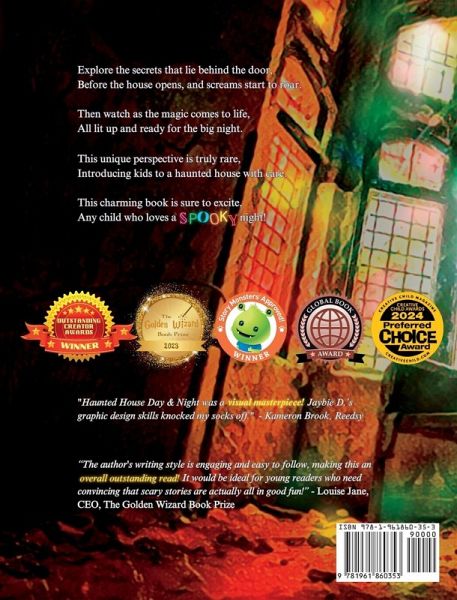 Mom's Choice Award Winner, Creative Child Magazine 2024 Preferred Choice Award, Story Monster Award, Outstanding Creator Award, The Golden Wizard Book Prize, Global Book Award Explore the secrets that lie behind the door, Before the house opens, and the screams start to roar. Then watch as the magic comes to life, All lit up and ready for the big night. This unique perspective is truly rare, Introducing kids to a haunted house with care. This charming book is sure to excite, Any child who loves a SPOOKY night!