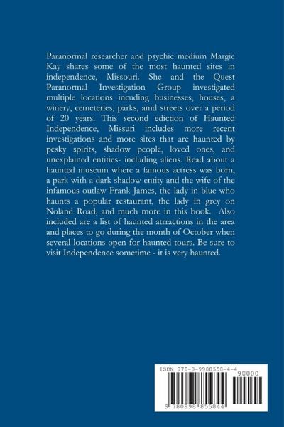 Paranormal researcher and psychic medium Margie Kay presents many of the most haunted locations in the city of Independence, Missouri. She and the Quest Investigation Group team investigated these sites over a period of 20 years. In this second edition of Haunted Independence, Missouri Margie discusses cases involving businesses, parks, cemeteries, and houses that are haunted by loved ones, poltergeists, shadow people and even aliens. Be sure to visit Independence sometime - it is very haunted!