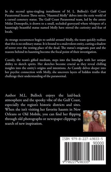In the second spine-tingling installment of M. L. Bullock's Gulf Coast Paranormal Season Three series, "Haunted Molly" delves into the eerie world of a cursed cemetery statue. The Gulf Coast Paranormal team, led by the astute Midas Demopolis, is drawn to a small, secluded graveyard where whispers of a hauntingly beautiful statue named Molly have stirred the curiosity and fear of locals. As strange occurrences begin to unfold around Molly, the team quickly realizes that this is no ordinary statue. It is bound to a malevolent entity, casting a shadow of terror over the resting place of the dead. The statue's enigmatic past and the reasons behind its haunting become the focal point of their investigation. Cassidy, the team's gifted medium, steps into the limelight with her unique ability to sketch spirits. Her sketches become crucial as they reveal chilling insights into the entity's origins and intentions. As Cassidy delves deeper into her psychic connection with Molly, she uncovers layers of hidden truths that challenge their understanding of the paranormal. The story weaves a tapestry of mystery and suspense, questioning the origins of the statue. Was Molly merely a memorial, or something far more sinister? The team must navigate a labyrinth of historical secrets and supernatural phenomena to uncover the truth. "Haunted Molly" is a haunting narrative of intrigue and otherworldly mystery. M. L. Bullock expertly combines the macabre allure of a ghost story with the thrilling pursuit of uncovering historical truths. In this world, every shadow and whisper carries the weight of a past waiting to be revealed. Join the Gulf Coast Paranormal team as they confront the unknown, where even the silent stone figures may have a story to tell.