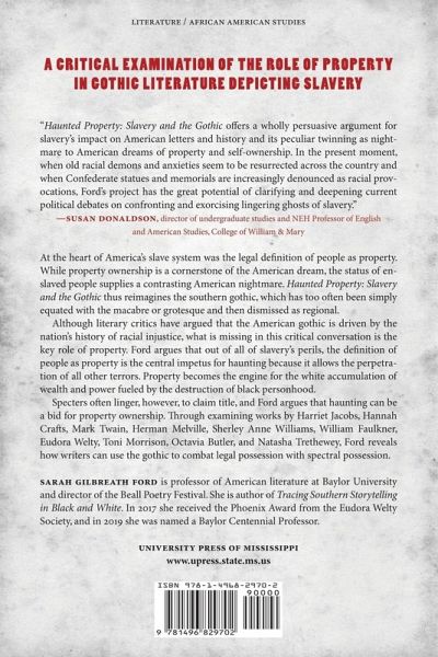 At the heart of America's slave system was the legal definition of people as property. While property ownership is a cornerstone of the American dream, the status of enslaved people supplies a contrasting American nightmare. Sarah Gilbreath Ford considers how writers in works from nineteenth-century slave narratives to twenty-first-century poetry employ gothic tools, such as ghosts and haunted houses, to portray the horrors of this nightmare. Haunted Property: Slavery and the Gothic thus reimagines the southern gothic, which has too often been simply equated with the macabre or grotesque and then dismissed as regional. Although literary critics have argued that the American gothic is driven by the nation's history of racial injustice, what is missing in this critical conversation is the key role of property. Ford argues that out of all of slavery's perils, the definition of people as property is the central impetus for haunting because it allows the perpetration of all other terrors. Property becomes the engine for the white accumulation of wealth and power fueled by the destruction of black personhood. Specters often linger, however, to claim title, and Ford argues that haunting can be a bid for property ownership. Through examining works by Harriet Jacobs, Hannah Crafts, Mark Twain, Herman Melville, Sherley Anne Williams, William Faulkner, Eudora Welty, Toni Morrison, Octavia Butler, and Natasha Trethewey, Ford reveals how writers can use the gothic to combat legal possession with spectral possession.