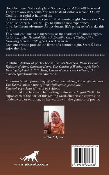 Don't be there. Not a safe place. So many ghosts! You will be scared. There are only dark souls. You will be dead within a second. Oh my God! Is that right? A haunted site! Still mind wants to touch a part of that haunted sight. No worries. May be not so scary, but still will go, to gather a new experience. It will be like an adventure. As ups-downs, life's parts; so let's make this time. This book contains so many writes, as the shadows of haunted sights. As for example- Haunted Palace, A Beautiful Girl, A Shabby Attire, Something is there, Existing part, The Armour etc. Each one tries to provide the flavor of a haunted sight. Scared? Let's enjoy the ride. ********************************************************** Published Author of poetry books- Thanks Dear God, Poetic Essence, Refection of Mind, Glittering Hopes, Tiny Garden of Words, Angels Smile, Dancing Alphabet, Artistic Muse, Essence of Love. Dear Children, The Magical Quill (available on Amazon). Can reach her at: afrosewritings@outlook.com. sabiha_pharma@yahho.com. You Tube: S Afrose *Muse of Writes*(@safrose_poetic_arts) Facebook page: Muse of Words by S Afrose. Author S Afrose has made her writing realm since August-2020. She enjoys each of the part of this writing ward. She tries to express the hidden word or emotion, by her words; with the glamour of poetry.