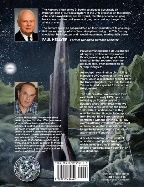 Volume 11 contains over 750 pages with a foreword written by retired USAF Colonel Charles Halt - then the Deputy Base Commander of RAF Woodridge - during the now famous UFO incident that has attracted worldwide attention, which took place in late December 1980. Like its predecessors Volumes 8, 9, and 10, it is also in colour but is even larger in pagination, making it excellent value for money. It continues with further chronological reports of UFO activity over Great Britain, USA, Australia, New Zealand and Tasmania, for the period 1989-1990. As with the former Volumes, published by the authors, this has been painstakingly and meticulously prepared from over 20 years research. It is priced at £25, which is good value taking into consideration the earlier books (Volumes 1-6, approximately 320 pages in black and white, sold at £14.99). John Hanson and Dawn Holloway, with Brenda Butler, have accumulated a vast amount of information over the years, including material from the late Essex UFO researcher Ron West, which identifies the presence of what has become labelled as appearances of the 'Triangular UFO', sighted over Belgium and Europe towards the end of the 1980s and, on occasion, chased by Air Force Jets. They will show that previously unpublished accounts of a 'wave' of similar sightings around the Essex area are now being brought to the attention of the public, who would not have been aware of how prolific sightings were during that period. Disappointingly, recent attempts to attract the attention of the Essex newspapers and media have been unsuccessful. The authors contend than nothing should be left out, as these books form part of our social history. It is their wish, at great personal expense to themselves, that these unique books will endure and provide future historians of the UFO subject an opportunity to see exactly what took place, rather than fading from history. It also includes an examination of UFO reports covering the period of 1963-1964, including some sightings from the archives of Project Blue Book for the first time. In addition, the Volume outlines the valuable commitment made by the researchers themselves and their efforts to preserve what forms part of our important social history, rather than relying on other dubious sources of information. Unfortunately, despite their greatest efforts, the authors have been unable to secure any reviews of their work by any of the National newspapers, although having sent many books to them. The authors point out that very few of the UFO sighting reports published in the Haunted Skies books will be found in any declassified MOD files.