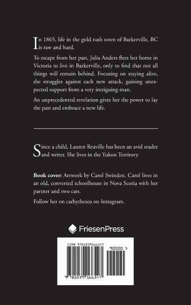 In 1865, life in the gold rush town of Barkerville, BC is raw and hard. To escape from her past, Julia Anders flees her home in Victoria to live in Barkerville, only to find that not all things will remain behind. Focusing on staying alive, she struggles against each new attack, gaining unexpected support from a very intriguing man. An unprecedented revelation gives her the power to lay the past and embrace a new life.