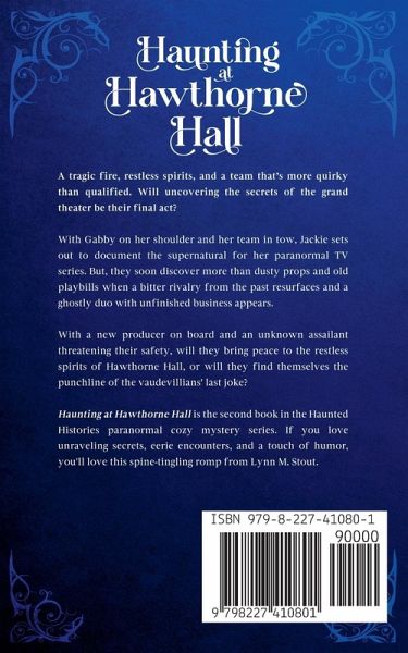 A tragic fire, restless spirits, and a team that's more quirky than qualified. Will uncovering the secrets of the grand theater be their final act? With Gabby on her shoulder and her team in tow, Jackie sets out to document the supernatural for her paranormal TV series. But, they soon discover more than dusty props and old playbills when a bitter rivalry from the past resurfaces and a ghostly duo with unfinished business appears. With a new producer on board and an unknown assailant threatening their safety, will they bring peace to the restless spirits of Hawthorne Hall, or will they find themselves the punchline of the vaudevillians' last joke? Haunting at Hawthorne Hall is the second book in the Haunted Histories paranormal cozy mystery series. If you love unraveling secrets, eerie encounters, and a touch of humor, start reading this spine-tingling romp from Lynn M. Stout today.