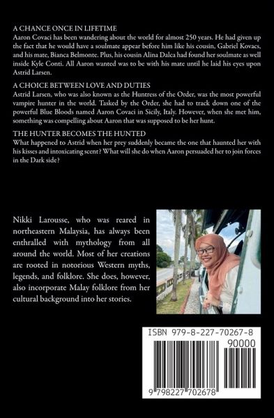 A CHANCE ONCE IN LIFETIME Aaron Covaci has been wandering about the world for almost 250 years. He had given up the fact that he would have a soulmate appear before him like his cousin, Gabriel Kovacs, and his mate, Bianca Belmonte. Plus, his cousin Alina Dalca had found her soulmate as well inside Kyle Conti. All Aaron wanted was to be with his mate until he laid his eyes upon Astrid Larsen. A CHOICE BETWEEN LOVE AND DUTIES Astrid Larsen, who was also known as the Huntress of the Order, was the most powerful vampire hunter in the world. Tasked by the Order, she had to track down one of the powerful Blue Bloods named Aaron Covaci in Sicily, Italy. However, when she met him, something was compelling about Aaron that was supposed to be her hunt. THE HUNTER BECOMES THE HUNTED What happened to Astrid when her prey suddenly became the one that haunted her with his kisses and intoxicating scent? What will she do when Aaron persuaded her to join forces in the Dark side?