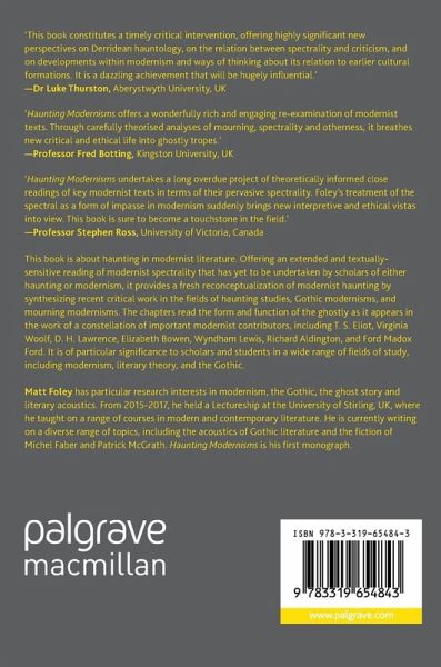 This book is about haunting in modernist literature. Offering an extended and textually-sensitive reading of modernist spectrality that has yet to be undertaken by scholars of either haunting or modernism, it provides a fresh reconceptualization of modernist haunting by synthesizing recent critical work in the fields of haunting studies, Gothic modernisms, and mourning modernisms. The chapters read the form and function of the ghostly as it appears in the work of a constellation of important modernist contributors, including T. S. Eliot, Virginia Woolf, D. H. Lawrence, Elizabeth Bowen, Wyndham Lewis, Richard Aldington, and Ford Madox Ford. It is of particular significance to scholars and students in a wide range of fields of study, including modernism, literary theory, and the Gothic.