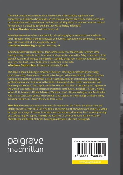 This book is about haunting in modernist literature. Offering an extended and textually-sensitive reading of modernist spectrality that has yet to be undertaken by scholars of either haunting or modernism, it provides a fresh reconceptualization of modernist haunting by synthesizing recent critical work in the fields of haunting studies, Gothic modernisms, and mourning modernisms. The chapters read the form and function of the ghostly as it appears in the work of a constellation of important modernist contributors, including T. S. Eliot, Virginia Woolf, D. H. Lawrence, Elizabeth Bowen, Wyndham Lewis, Richard Aldington, and Ford Madox Ford. It is of particular significance to scholars and students in a wide range of fields of study, including modernism, literary theory, and the Gothic.