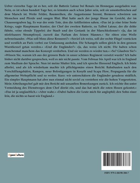 Ueber vierzehn Tage ist es her, seit die Batterie Latour bei Renaix im Hennegau ausgeladen war. Nein, es ist schon hundert Tage her, es könnten auch schon Jahre sein, seit sie ununterbrochen auf dem Marsch ist. Weite Felder, Baumreihen, die Augustsonne brennt, Bremsen schwirren um Menschen und Pferde und saugen Blut. Blut hatte auch der junge Husar im Gesicht, der im Chausseegraben lag. Es war der erste Tote, den die Artilleristen sahen. »Das ist ja eine feine Sorte Krieg«, sagte Hauptmann Kuntze, der Chef der zweiten Batterie, zu Talbot Latour, der die dritte führte, »eine elende Tippelei: der Staub und der Gestank in der Marschkolonne!« »Ja, das ist stiefelsaures Strumpfoxyd, zurzeit das Parfum des feinen Mannes.« Sie ritten eine Weile nebeneinander. »Was soll bloss diese Rennerei?« »Soviel ich weiss, soll der rechte Flügel vorrücken und westlich an Paris vorbei zur Umfassung ausholen. Die Schangels sollen gleich in den grossen Wurstkessel getan werden.« »Und die Engländer?« »Ja, das weiss ich nicht. Die haben schon manchesmal manchem das Konzept verdorben. Und sie werden es wieder tun.« »So? Glauben Sie?« »Wissen Sie, warum ich aus der grossen Bude in unser schönes Regiment versetzt wurde? Ich habe bisher nicht darüber gesprochen, weil es mir nicht passte. Vom Februar bis April war ich in England zum Studium der Sprache. Nun ist meine Mutter Irin, und ich spreche fliessend Englisch. Ich hörte allerlei, und als ich wiederkam machte ich pflichtgemäss einen Bericht: Bahnbauten nach den Verschiffungshäfen, Rampen, neue Befestigungen in Kosyth und Scapa Flow, Propaganda für die allgemeine Wehrpflicht und so weiter. Kurz: wir unterschätzen die Engländer geradezu sträflich. Ein simpler Hauptmann hat aber nun einmal nicht soviel zu verstehen wie die hohen Vorgesetzten. Mein Abteilungschef gab mir den Bericht mit unsanften Bemerkungen zurück. Ich reichte ihn unter Vermeidung des Dienstweges dem Chef direkt ein, und das hat mich die roten Hosen gekostet.« »Das ist ja unglaublich.« »Aber wahr.« »Dabei halten die Leute mich für anglophil; den Sohn einer Irin, die nichts so hasst wie England.«