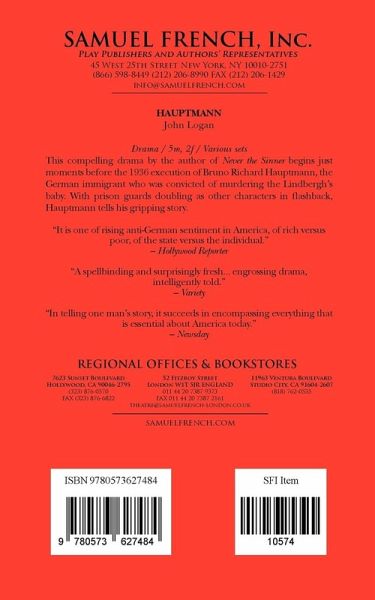 Drama John Logan Characters: 5 male, 2 female Various sets. This compelling drama by the author of Never the Sinner begins just moments before the 1936 execution of Bruno Richard Hauptmann, the German immigrant who was convicted of murdering the Lindbergh's baby. With prison guards doubling as other characters in flashback, Hauptmann tells his gripping story. "It is one of rising anti German sentiment in America, of rich versus poor, of the state versus the individual." Hollywood Reporter. "A spellbinding and surprisingly fresh ... engrossing drama, intelligently told." Variety. "In telling one man's story, it succeeds in encompassing everything that is essential about America today." Newsday.