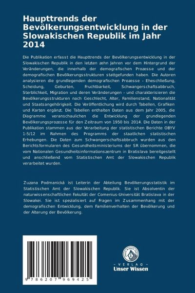 Die Publikation erfasst die Haupttrends der Bevölkerungsentwicklung in der Slowakischen Republik in den letzten zehn Jahren vor dem Hintergrund der Veränderungen, die innerhalb der demografischen Prozesse und der demografischen Bevölkerungsstrukturen stattgefunden haben. Die Autoren analysieren die grundlegenden demografischen Prozesse - Eheschließung, Scheidung, Geburten, Fruchtbarkeit, Schwangerschaftsabbruch, Sterblichkeit, Migration und deren Veränderungen - und charakterisieren die Bevölkerungsstrukturen nach Geschlecht, Alter, Familienstand, Nationalität und Staatsangehörigkeit. Die Veröffentlichung wird durch Tabellen, Grafiken und Karten ergänzt. Die Tabellen enthalten Daten aus dem Jahr 2005, die Diagramme veranschaulichen die Entwicklung der grundlegenden Bevölkerungsprozesse für den Zeitraum von 1950 bis 2014. Die Daten in der Publikation stammen aus der Verarbeitung der statistischen Berichte OBYV 1-5/12 im Rahmen des Programms der staatlichen statistischen Erhebungen. Die Daten zum Schwangerschaftsabbruch wurden aus den Berichtsformularen des Gesundheitsministeriums der SR übernommen, die vom Nationalen Gesundheitsinformationszentrum in Bratislava bereitgestellt und anschließend vom Statistischen Amt der Slowakischen Republik verarbeitet wurden.