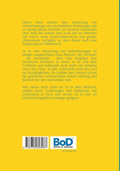 Dieser Band enthält eine Sammlung von Aufzeichnungen aus persönlichen Erfahrungen, die in vierzig Jahren Arbeiten an Häusern entstanden sind. Teile des Inhalts sind auch auf der Webseite des Autors unter bauen.chinnow.net verfügbar, so dass dieses Buch eine Ergänzung zur Webseite ist.Es ist eine Sammlung von Aufzeichnungen zu einigen ausgesuchten Haus-Themen. Der Verfasser - ein Autodidakt - hielt sein Vorgehen fest, bestimmte Probleme zu lösen. Es ist also kein Profibuch und behandelt auch nicht alle Arbeiten rund ums Haus. Es gibt vermutlich auch hier und da Unrichtigkeiten. Im Großen und Ganzen sollten die gelieferten Informationen jedoch stimmig und hilfreich für den Heimwerker sein.Was dieses Buch nicht ist: Es ist kein Bildband, enthält kaum Erzählungen und Anekdoten von Erlebnissen in Haus und Garten. Es ist also als Unterhaltungslektüre weniger geeignet.Themen: Kaminofen, Brennwertheizung, Regenwasser-Nutzungsanlage, Dachausbau, Dachflächenfenster, Schimmel, Mauern, Fundamente erstellen, Verputzen, Risse schließen, Tapezieren, Fliesen & Verfugen, U-Wertberechnung, Aussen-Anstrich, Sichtschutzwand, Terrassendach, Dacheindeckung, Rasen Neuanlage & Pflege, Pflanz- & Erntezeiten, Obstbaumschnitt, Gartentipps, Lagerdauer für Obst & Gemüse