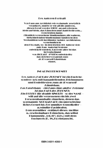 HAUS der ZUKUNFT ist ein Buch besonderer Art; mit bauanleitenden Zeichnungen und Begleittexten zum do it yourself Häuslebauen. HAUS der ZUKUNFT ist in Fakt ein Passivhaus ¿ ein Haus ohne aktive Heizung, kann eben - ja muß das HAUS der ZUKUNFT sein; heute und morgen mehr denn je zuvor. Ein DOUBLO für double SINGLES ¿ so der Untertitel¿ will auf die vergessenen ein bis zwei Personenhaushalte eingehen, denen das so genannte NORMALHAUS ein unerschwingliches Greuel- dem unnützen Gruselkeller und windigen Dachboden - ist. Dem gegenüber tauscht dieses charmante, und erschwingbare Traumhaus selbst das Planungshonorar (rd.10% d.Bs.), mit dem erkläglichen Sümmchen des Buchpreises 98,75 Euro's ein. Ein Traumhaus mit 106,5 m² netto Wohnfläche auf eineinhalb Ebenen und einer mittleren Wohnraumhöhe von 3,85 Metern für rd. ¿84.ooo,- plus ¿ 42.ooo,- als Eigenleistung; was einem Quadratmeterpreis von ¿ 643,- und ¿ 322,- entspricht.