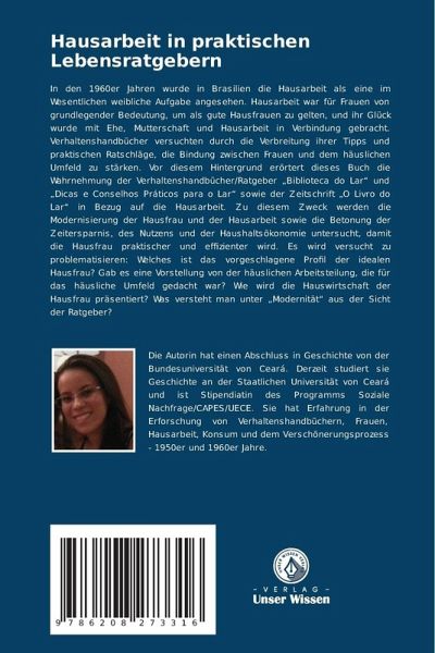 In den 1960er Jahren wurde in Brasilien die Hausarbeit als eine im Wesentlichen weibliche Aufgabe angesehen. Hausarbeit war für Frauen von grundlegender Bedeutung, um als gute Hausfrauen zu gelten, und ihr Glück wurde mit Ehe, Mutterschaft und Hausarbeit in Verbindung gebracht. Verhaltenshandbücher versuchten durch die Verbreitung ihrer Tipps und praktischen Ratschläge, die Bindung zwischen Frauen und dem häuslichen Umfeld zu stärken. Vor diesem Hintergrund erörtert dieses Buch die Wahrnehmung der Verhaltenshandbücher/Ratgeber "Biblioteca do Lar" und "Dicas e Conselhos Práticos para o Lar" sowie der Zeitschrift "O Livro do Lar" in Bezug auf die Hausarbeit. Zu diesem Zweck werden die Modernisierung der Hausfrau und der Hausarbeit sowie die Betonung der Zeitersparnis, des Nutzens und der Haushaltsökonomie untersucht, damit die Hausfrau praktischer und effizienter wird. Es wird versucht zu problematisieren: Welches ist das vorgeschlagene Profil der idealen Hausfrau? Gab es eine Vorstellung von der häuslichen Arbeitsteilung, die für das häusliche Umfeld gedacht war? Wie wird die Hauswirtschaft der Hausfrau präsentiert? Was versteht man unter "Modernität" aus der Sicht der Ratgeber?