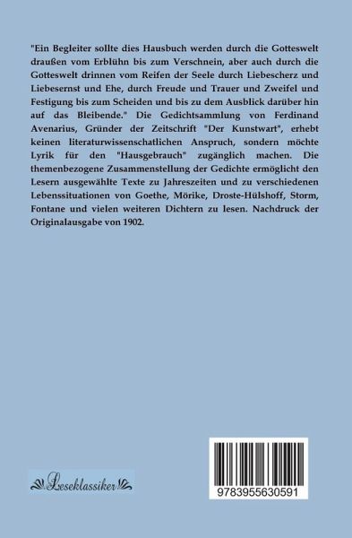 "Ein Begleiter sollte dies Hausbuch werden durch die Gotteswelt draußen vom Erblühn bis zum Verschnein, aber auch durch die Gotteswelt drinnen vom Reifen der Seele durch Liebescherz und Liebesernst und Ehe, durch Freude und Trauer und Zweifel und Festigung bis zum Scheiden und bis zu dem Ausblick darüber hin auf das Bleibende." Die Gedichtsammlung von Ferdinand Avenarius, Gründer der Zeitschrift "Der Kunstwart", erhebt keinen literaturwissenschatlichen Anspruch, sondern möchte Lyrik für den "Hausgebrauch" zugänglich machen. Die themenbezogene Zusammenstellung der Gedichte ermöglicht den Lesern ausgewählte Texte zu Jahreszeiten und zu verschiedenen Lebenssituationen von Goethe, Mörike, Droste-Hülshoff, Storm, Fontane und vielen weiteren Dichtern zu lesen. Nachdruck der Originalausgabe von 1902.