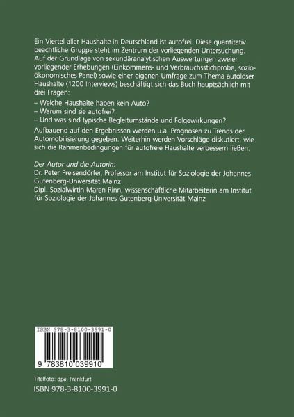Ein Viertel aller Haushalte in Deutschland ist autofrei. Diese quantitativ beachtliche Gruppe steht im Zentrum der vorliegenden Untersuchung. Auf der Grundlage von sekundäranalytischen Auswertungen zweier vorliegender Erhebungen (Einkommens- und Verbrauchsstichprobe, sozio-ökonomisches Panel) sowie einer eigenen Umfrage zum Thema autoloser Haushalte (1200 Interviews) beschäftigt sich das Buch hauptsächlich mit drei Fragen: - Welche Haushalte haben kein Auto? - Warum sind sie autofrei? - Und was sind typische Begleitumstände und Folgewirkungen? Aufbauend auf den Ergebnissen werden u.a. Prognosen zu Trends der Automobilisierung gegeben. Weiterhin werden Vorschläge diskutiert, wie sich die Rahmenbedingungen für autofreie Haushalte verbessern ließen.