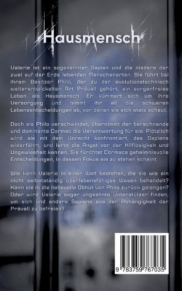 Valerie ist ein sogenannter Sapien und die niedere der zwei auf der Erde lebenden Menschenarten. Sie führt bei ihrem Besitzer Philo, der zu der evolutionstechnisch weiterentwickelten Art Prävali gehört, ein sorgenfreies Leben als Hausmensch. Er kümmert sich um ihre Versorgung und nimmt ihr all die schweren Lebensentscheidungen ab, vor denen sie sich stets scheut.Doch als Philo verschwindet, übernimmt der berechnende und dominante Cormac die Verantwortung für sie. Plötzlich wird sie mit dem Unrecht konfrontiert, das Sapiens widerfährt, und lernt die Angst vor der Hilflosigkeit und Ungewissheit kennen. Sie fürchtet Cormacs geheimnisvolle Entscheidungen, in dessen Fokus sie zu stehen scheint.Wie kann Valerie in einer Welt bestehen, die sie wie ein nicht selbstständig überlebensfähiges Wesen behandelt? Kann sie in die liebevolle Obhut von Philo zurück gelangen? Oder wird Valerie sogar ungeahnte Unterstützer finden, um sich und andere Sapiens aus der Abhängigkeit der Prävali zu befreien?
