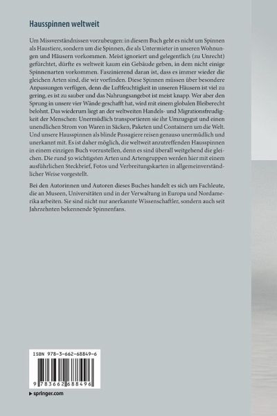 Spinnen, die als Untermieter in unseren Häusern vorkommen, werden meist ignoriert und gelegentlich (zu Unrecht) gefürchtet. Es dürfte weltweit kaum ein Gebäude geben, in dem nicht einige Spinnenarten vorkommen. Faszinierend daran ist, dass es immer wieder die gleichen Arten sind. Sie verfügen über besondere Anpassungen, denn die Luftfeuchtigkeit ist viel zu gering, es ist zu sauber und das Nahrungsangebot ist knapp. Wer aber den Sprung in unsere vier Wände geschafft hat, wird mit einem globalen Bleiberecht belohnt. Das liegt an der weltweiten Handels- und Migrationsfreudigkeit der Menschen: Sie transportieren einen unendlichen Strom von Waren um die Welt. Und unsere Hausspinnen reisen unerkannt mit. Es ist daher möglich, die weltweit anzutreffenden Hausspinnen in einem einzigen Buch vorzustellen, denn es sind überall weitgehend die gleichen. Die rund 50 wichtigsten Arten und Artengruppen werden mit einem ausführlichen Steckbrief, Fotos und Verbreitungskarten in allgemeinverständlicher Weise vorgestellt.