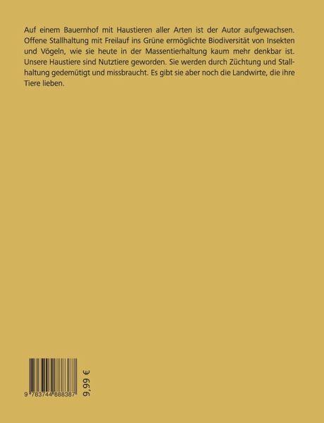 Auf einem Holsteiner Bauernhof mit Haustieren aller Arten ist der Autor mit Hühnern, Schweinen, Kühen, Pferden, Tauben, Regenwürmern, Kapfen und anderem Getier aufgewachsen. Erst in den siebziger Jahren setzte sich die Intensivhaltung durch. Unsere Haustiere heißen heute Nutztiere. So prägt die Sprache das Tun: Unsere Tiere sind zu Produktionsmitteln degradiert und werden durch Züchtung und Intensivhaltung gedemütigt und missbraucht. Durch Rationalisierung und Globalisierung ist eine uralte Lebensgemeinschaft, in der wir mit unseren Tieren gelebt haben, verloren gegangen. Marktwirtschaft und EU-Agrarpolitik zwingen alte Familienbetriebe zu Investitionen, die sich nur durch Massentierhaltung und Exporte amortisieren können. Das stolze Berufsbild des Landwirts ist in Verruf geraten.Die fehlende gesellschaftliche Akzeptanz dieser Landwirtschaft, die Forderung nach Tierwohl, offener Stallhaltung und Weidegang erzwingt eine Wende in der Tierhaltung und der Subventionspolitik. Nur so wird ermöglicht dass die Tierhaltung auf unseren Höfen wieder zur Biodiversität, zu mehr Vögeln und Insekten, führt. Die Förderung von besucherfreundlichen, artenreichen Bauernhöfen schafft Störchen, Rauchschwalben, Fliegen und Käfern wieder Lebensraum und den Bürgern wieder Naturerlebnisse wie wir sie für unsere Kinder brauchen. Die Kollaterallschäden unserer Marktwirtschaft und die Sünden der bisherigen EU-Agrarpolitik können überwunden werden.Basierend auf dem britischen Konzept der Fünf Freiheiten für unsere Haustiere ist weitere Forschung notwendig und wird zu neuen Richtlinien und Standards auch auf EU-Ebene führen. Entsprechende Modellhöfe gibt es schon heute.Ausgewählte Höfe sind heute in der ökologischen Landwirtschaft und Verbänden vernetzt und erfreuen sich vieler Kunden Dank Direktvermarktung. Handel, Unternehmen, die Lebensmittel verarbeiten, haben verstanden, dass sie sich um das Tierwohl ihrer Landwirte bemühen müssen, um verbraucherfreundliche Produkte anzubieten. Die Reform unserer tierhaltenden Landwirtschaft kann nicht über produktorientierte Prozesse mit Fleisch, Eiern und Milch erreicht werden. Unsere Haustiere selbst und ihre Bedürfnisse sind das Thema eines gesellschaftlichen Dialoges nach dem Mensch und Tier wieder zueinander finden müssen.