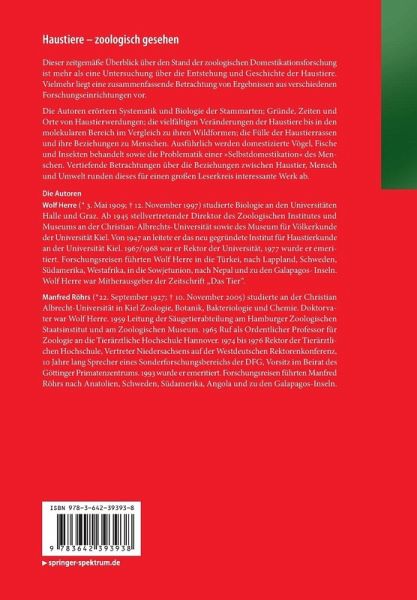 Wolf Herre (* 3. Mai 1909 in Halle an der Saale; ¿ 12. November 1997) studierte Biologie an den Universitäten Halle und Graz. 1935 habilitierte er sich für Zoologie und Vergleichende Anatomie. Nach Kriegsdienst und Gefangenschaft wurde er 1945 stellvertretender Direktor des Zoologischen Institutes und Museums an der Christian-Albrechts-Universität sowie des Museum für Völkerkunde der Universität Kiel. Ab 1947 leitete er das neu gegründete Institut für Haustierkunde an der Universität Kiel und wurde 1952 zum ordentlichen Professor ernannt. 1967/1968 war er Rektor der Universität, 1977 wurde er emeritiert. Forschungsreisen führten Wolf Herre in die Türkei, nach Lappland, Schweden, Südamerika, Westafrika, in die Sowjetunion, nach Nepal und zu den Galapagos-Inseln. 1972 übernahm er eine Gastprofessur in Ky¿to (Japan). Wolf Herre war Mitherausgeber der Zeitschrift "Das Tier". Manfred Röhrs (*22. September 1927 in Rotenburg an der Wümme; ¿ 10. November 2005) studierte an der Christian Albrecht-Universität in Kiel Zoologie, Botanik, Bakteriologie und Chemie. Doktorvater war Wolf Herre. 1959 Leitung der Säugetierabteilung am Hamburger Zoologischen Staatsinstitut und am Zoologischen Museum. 1965 Ernennung zum Außerplanmäßigen Professor an der Universität Hamburg und Ruf als Ordentlicher Professor für Zoologie an die Tierärztliche Hochschule Hannover. 1974 bis 1976 Rektor der Tierärztlichen Hochschule, Vertreter Niedersachsens auf der Westdeutschen Rektorenkonferenz, 10 Jahre lang Sprecher eines Sonderforschungsbereichs der DFG, Vorsitz im Beirat des Göttinger Primatenzentrums. 1993 wurde er emeritiert. Forschungsreisen führten Manfred Röhrs nach Anatolien, Schweden, Südamerika, Angola und zu den Galapagos-Inseln.