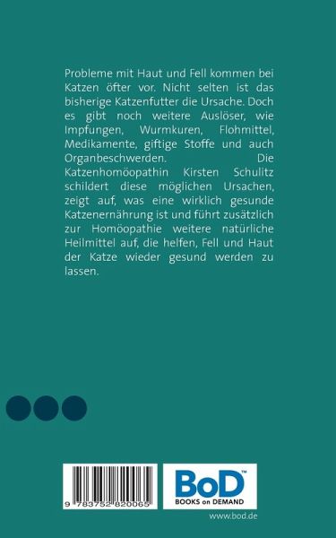 Probleme mit Haut und Fell kommen bei Katzen öfter vor. Nicht selten ist das bisherige Katzenfutter die Ursache. Doch es gibt noch weitere Auslöser, wie Impfungen, Wurmkuren, Flohmittel, Medikamente, giftige Stoffe und auch Organbeschwerden. Die Katzenhomöopathin Kirsten Schulitz schildert diese möglichen Ursachen, zeigt auf, was eine wirklich gesunde Katzenernährung ist und führt zusätzlich zur Homöopathie weitere natürliche Heilmittel auf, die helfen, Fell und Haut der Katze wieder gesund werden zu lassen.